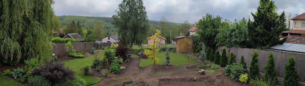 Itt egy tavalyi panorámakép a kert hátsó részéről. Azóta a dombra halmoztunk még, természetesebbé tettük, meg ültettünk rá. Mivel ez egy nagy és elég költséges projekt, így legalább annyival előremozdítottam, hogy a fákat, a vázat elültettem, hogy nyerjek pár évet a növekedésükkel.