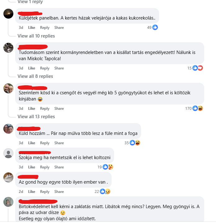 Nálunk az övezetünkben egyébként nem lehet ólat építeni, és mégis vannak háztáji állatok a környéken. Szerintem ezzel egyébként semmi gond nincs, vagyis addig nincs gond, amíg az arc arányos a jogsértés felfogásával: tudom, hogy törvényt sértek, de pont ezért mintagazda vagyok, aki kifejezetten igyekszik, hogy a törvénysértő viselkedésével ne zavarja a környéket. A helyi csoportunkban az egyik kedvenc bejegyzésem pár évvel ezelőttről, hogy "tudom, hogy ordít a Lajos, pár hét és leves lesz belőle, addig kitartás és bocsi!" Imádom. Remélhetőleg az elhíresült kakas volt a Lajos, és nem valaki más...